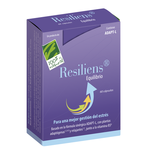 Resiliens® Equilibrio is a food supplement from the Resiliens® line that helps the body better manage stress and maintain emotional stability and physical and mental well-being . It is based on the synergistic formula ADAPT-L , composed of a combination of adaptogenic plants (Ashwagandha, Schisandra, Rhodiola and Eleutherococcus) and relaxants (Chamomile) along with vitamin B5 .