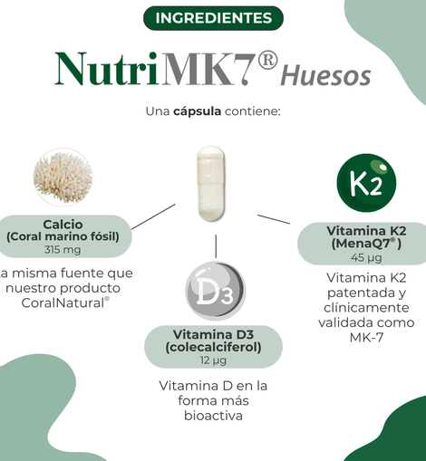 Ingredients : Calcium carbonate (CoralNatural ® ); vegetable capsule; bulking agent: microcrystalline cellulose; menaquinone (vitamin K2, MenaQ7 ® ); anti-caking agent: vegetable magnesium stearate; cholecalciferol (vitamin D3); anti-caking agent: silicon dioxide.