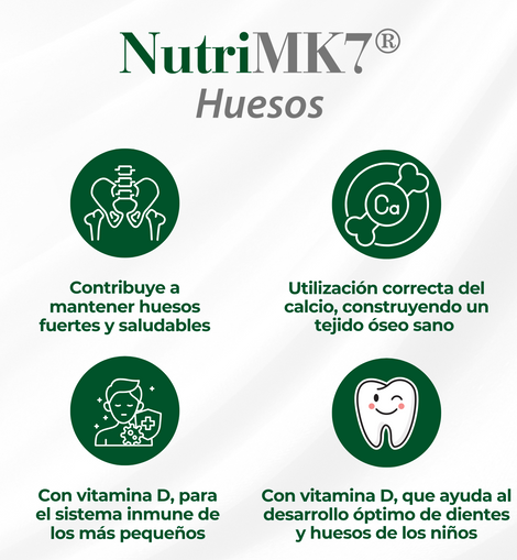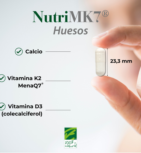 In NutriMk7 ® vitamin K2 is of plant origin (extracted from chickpea fermentation) in the form of Menaquinone 7 (MK-7) , due to its better bioavailability . A new technology is also incorporated (MenaQ7 Crystals) that uses a patented process that results in a natural, all-trans vitamin K2, with an MK7 purity that exceeds 96%. Free of soy and other known allergens.