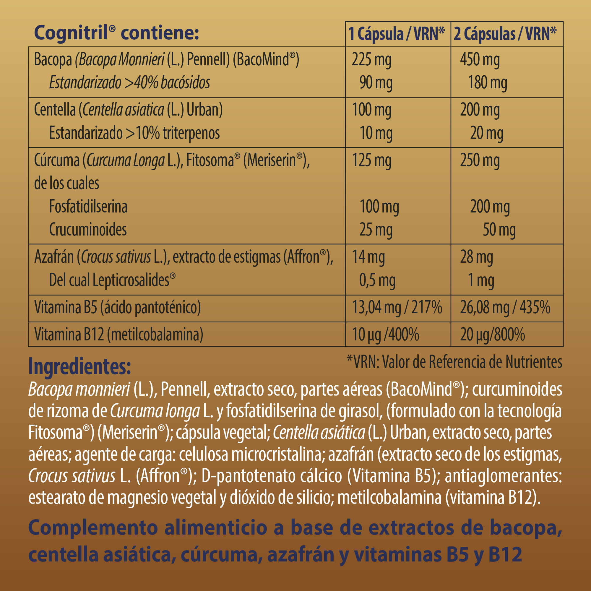 Ingredientes: Bacopa monnieri (L.), Pennell, extracto seco, partes aereas (BacoMind® Curcuma longa L. y fosfatidilserina de girasol, (formulado con la tecnologia Fitosoma® Centella asiática (L.) Urban, extracto seco, partes aereas; agente de carga: celulosa microcristalina; azafrán (extracto seco de los estigmas, Crocus sativus L. (Affron®).