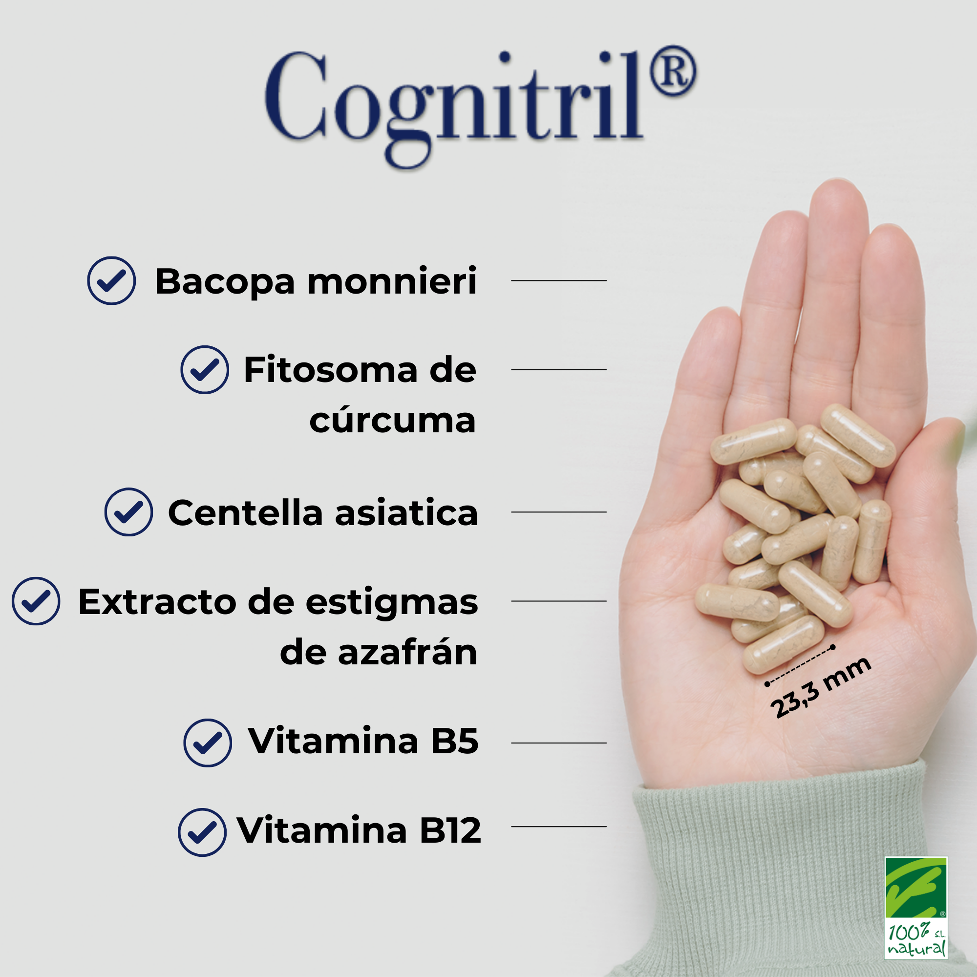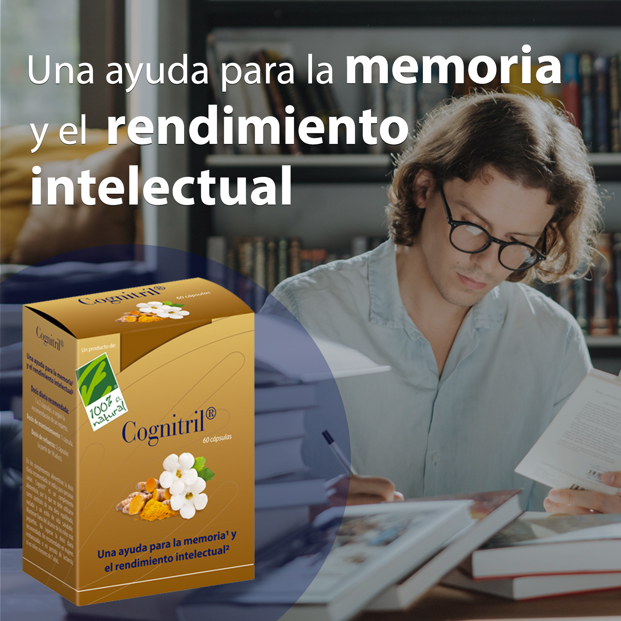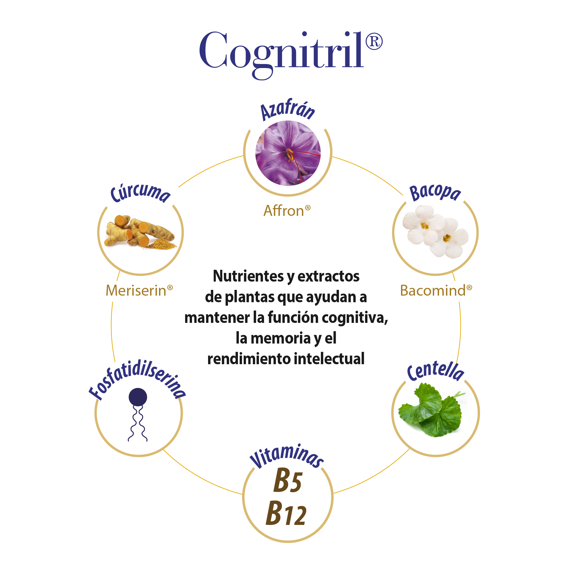 Una ayuda para la memoria y el rendimiento intelectual. Cognitril® es una completa fórmula a base de Bacopa monnieri (Bacomind®), Cúrcuma asociada a fosfatidilserina (Meriserin®, con tecnología Fitosoma®), Centella asiática, azafrán (Affron®) y vitaminas B5 y B12.