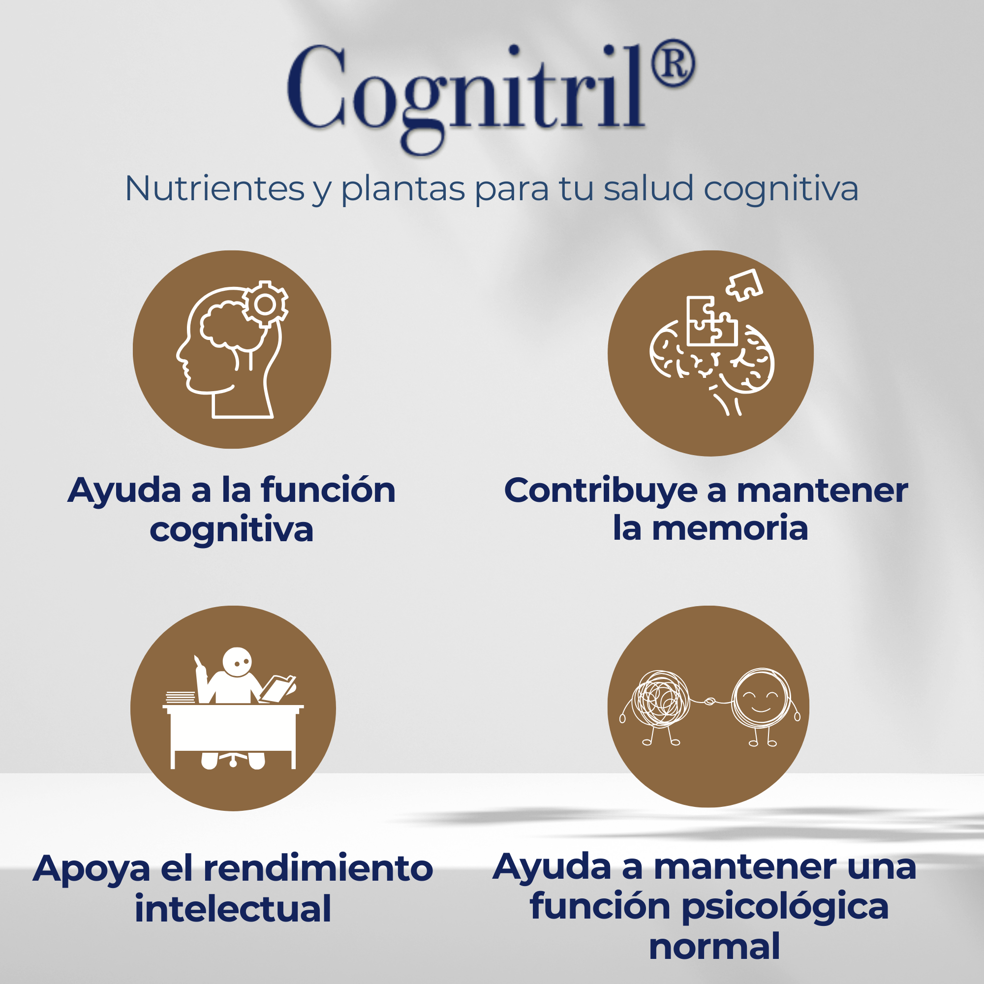 MEMORIA Y CONCENTRACIÓN: Cognitril® está formulado con nutrientes y extractos patentados de plantas que ayudan a mantener y cuidar la función cognitiva, la memoria y el rendimiento intelectual.