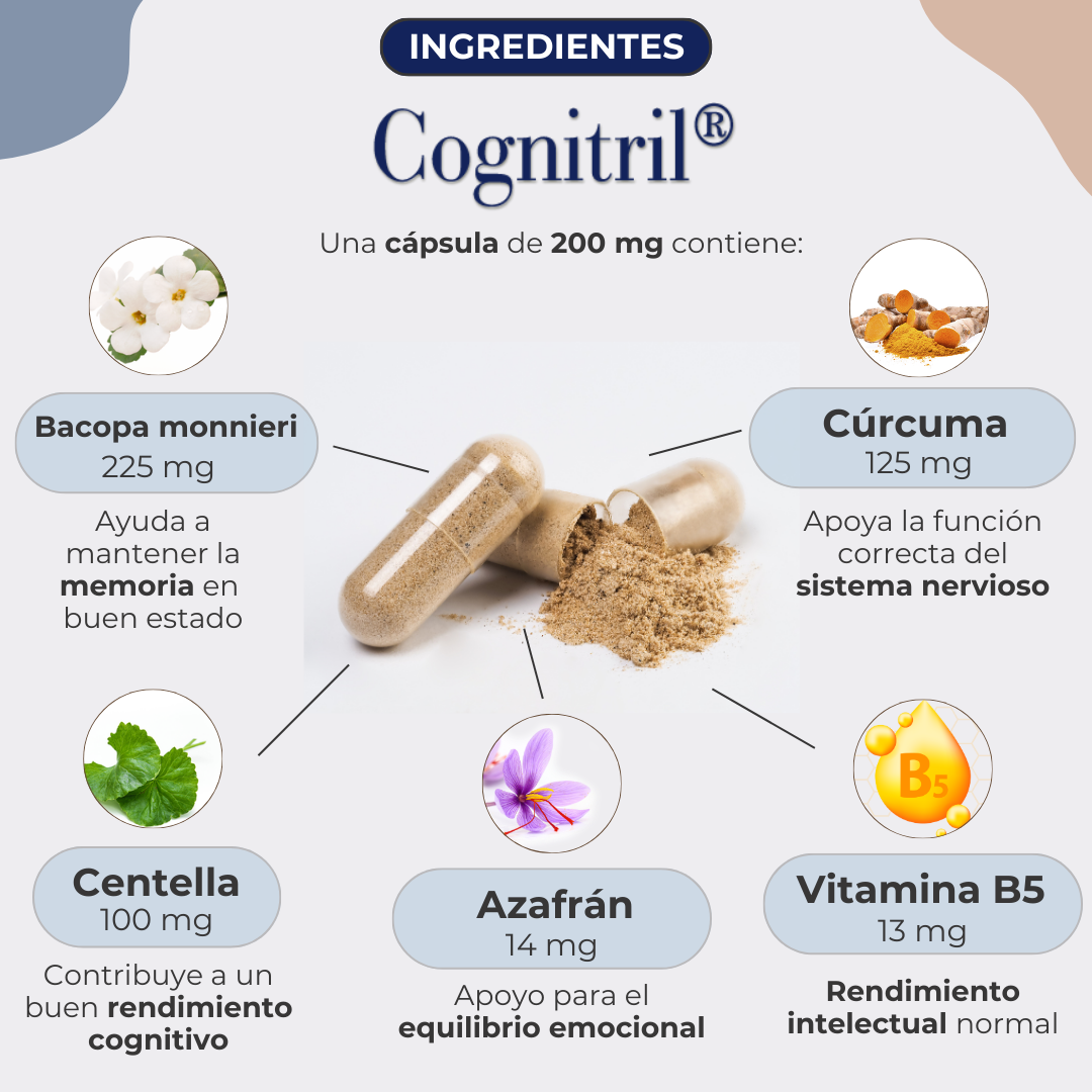 Complemento alimenticio a base de extractos patentados de Bacopa monnieri (BacoMind®), cúrcuma asociada a fosfatidilserina (Meriserin®) y Centella asiatica estandarizada en triterpenos, junto con un extracto patentado de estigmas de azafrán (Affron®) y vitaminas B5 y B12. Cognitril® está formulado con nutrientes y extractos de plantas que ayudan a mantener la función cognitiva, la memoria y el rendimiento intelectual.