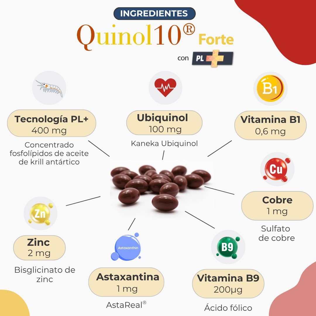 O Quinol10® Forte com PL+ incorpora astaxantina, um carotenoide natural com capacidade antioxidante, juntamente com os ácidos gordos ómega-3 EPA e DHA provenientes do óleo de krill. O EPA e o DHA contribuem para o funcionamento normal do coração quando são consumidos 250 mg por dia. Esta combinação reforça a proteção celular e complementa a abordagem integral do produto na energia, bem-estar e saúde cardiovascular.