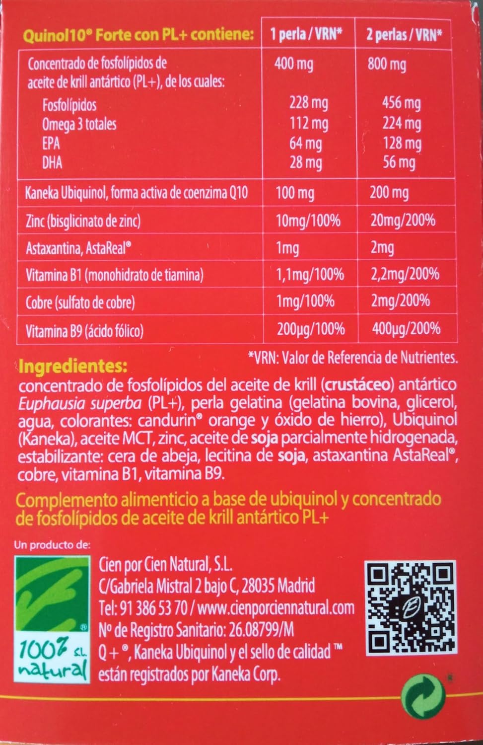 Ingredientes: concentrado de fosfolípidos do óleo de krill (crustáceo) antártico Euphausia superba (PL+), pérola gelatina (gelatina bovina, glicerol, água, corantes: candurin®;orange e óxido de ferro), Ubiquinol (Kaneka), óleo MCT, zinco, óleo de soja parcialmente hidrogenada, estabilizador: cera de abelha, lecitina de soja, astaxantina AstaReal®, cobre, vitamina B1, vitamina B9.