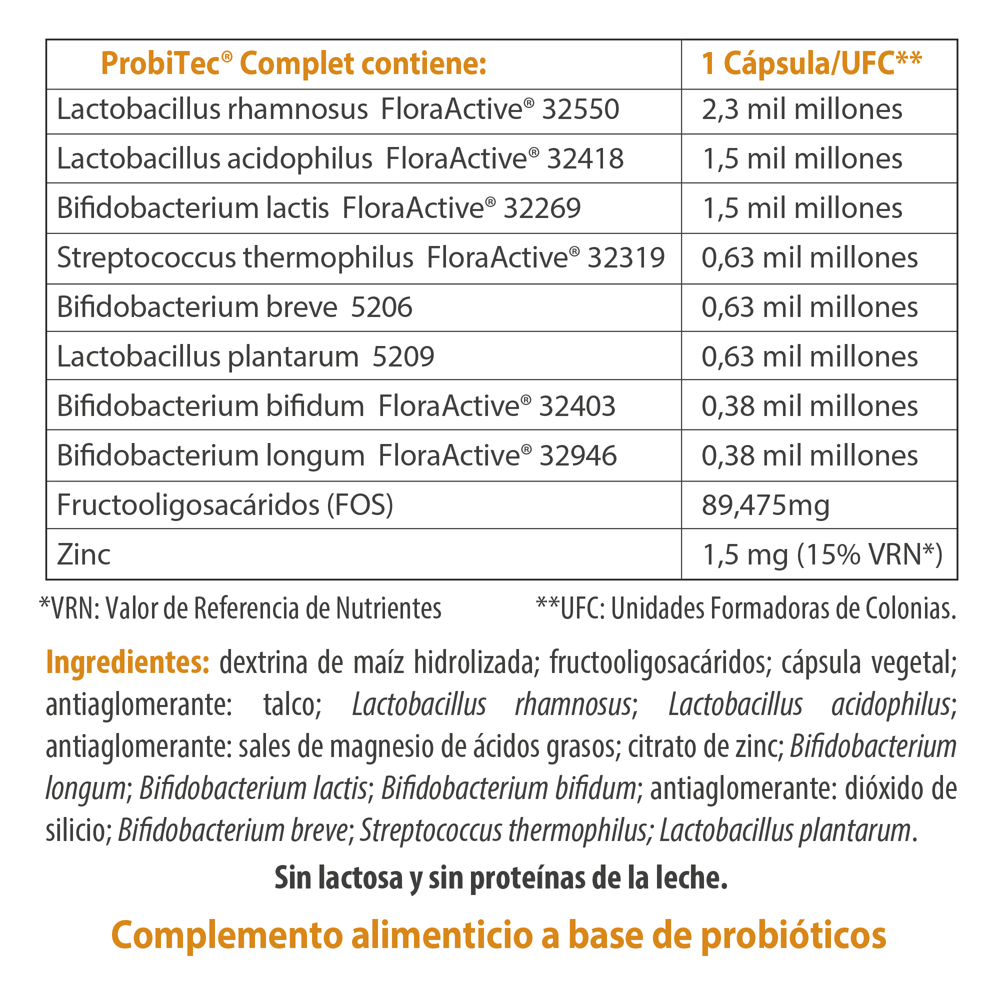 Dextrina de milho hidrolisada; fruto-oligossacáridos; cápsula vegetal; antiaglomerante: talco; Lactobacillus rhamnosus; Lactobacillus acidophilus; antiaglomerante: sais de magnésio de ácidos gordos; citrato de zinco; Bifidobacterium longum; Bifidobacterium lactis; Bifidobacterium bifidum; antiaglomerante: dióxido de silício; Bifidobacterium breve; Streptococcus thermophilus; Lactobacillus plantarum.
