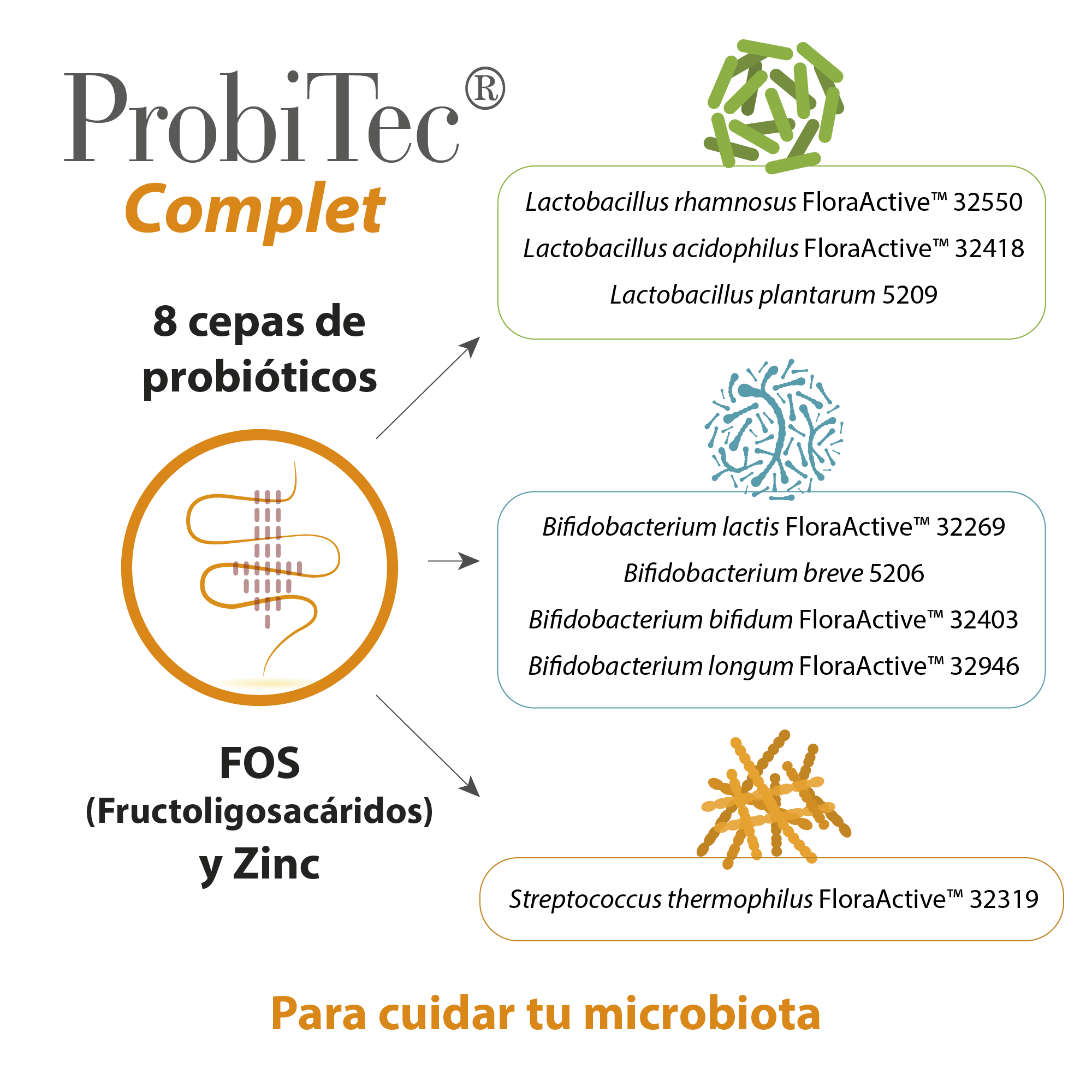 ProbiTec® Complet é um produto da linha ProbiTec®. Uma fórmula que combina 8 estirpes de Bactérias benéficas, FOS e Zinco.