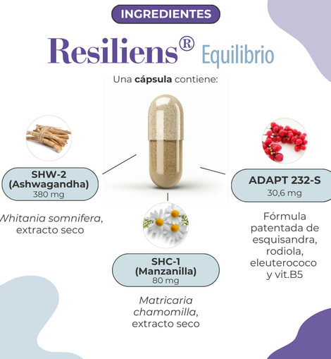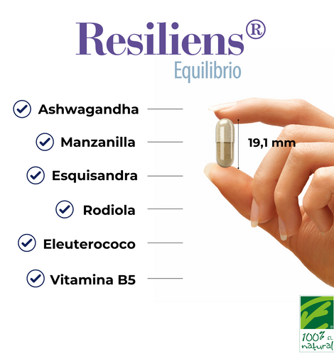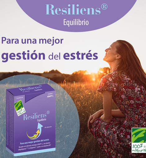 O Resiliens® Equilíbrio é um suplemento alimentar da linha Resiliens® que ajuda o corpo a gerir melhor o stress e a manter a estabilidade emocional e o bem-estar físico e mental. Baseia-se na fórmula sinérgica ADAPT-L, composta por uma combinação de plantas adaptogénicas (Ashwagandha, Esquisandra, Rodiola e Eleuterococo) e relaxantes(Camomila) juntamente com vitamina B5.